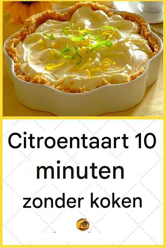 De 10 minuten durende, no-bake citroentaart is een taart met een bodem van droge koekjes en boter, afgetopt met slagroom, gecondenseerde melk en citroensap.