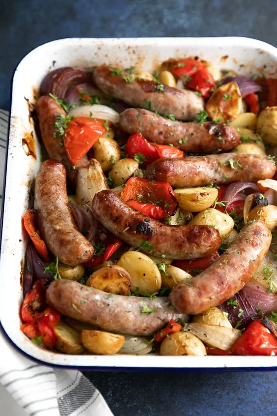 Dit recept voor worst en aardappelen is eenvoudig en heerlijk. Het zit boordevol uien, Italiaanse worst, paprika en krieltjes. Geniet van deze stevige, gezinsvriendelijke maaltijd als snelle maaltijd doordeweeks en gebruik de restjes om de volgende middag mee te koken.