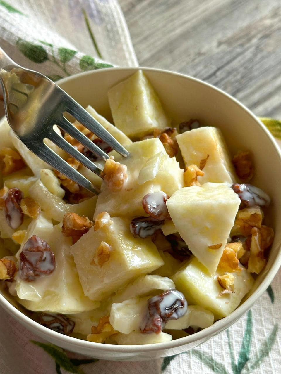 Ervaar de tijdloze aantrekkingskracht van een klassieke Waldorfsalade, een verfrissende combinatie van knapperige appels, knapperige walnoten en zoete rozijnen, allemaal omhuld door een romige dressing. Deze salade is perfect voor elke gelegenheid, van picknicks tot feestdagen, en biedt een heerlijke mix van texturen en smaken.