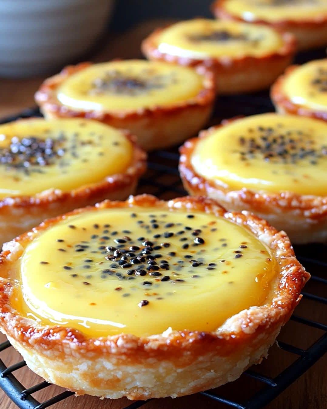 - Besprenkel de bovenkant van elk taartje vlak voor het serveren met vers passievruchtenpulp voor een extra smaakexplosie.