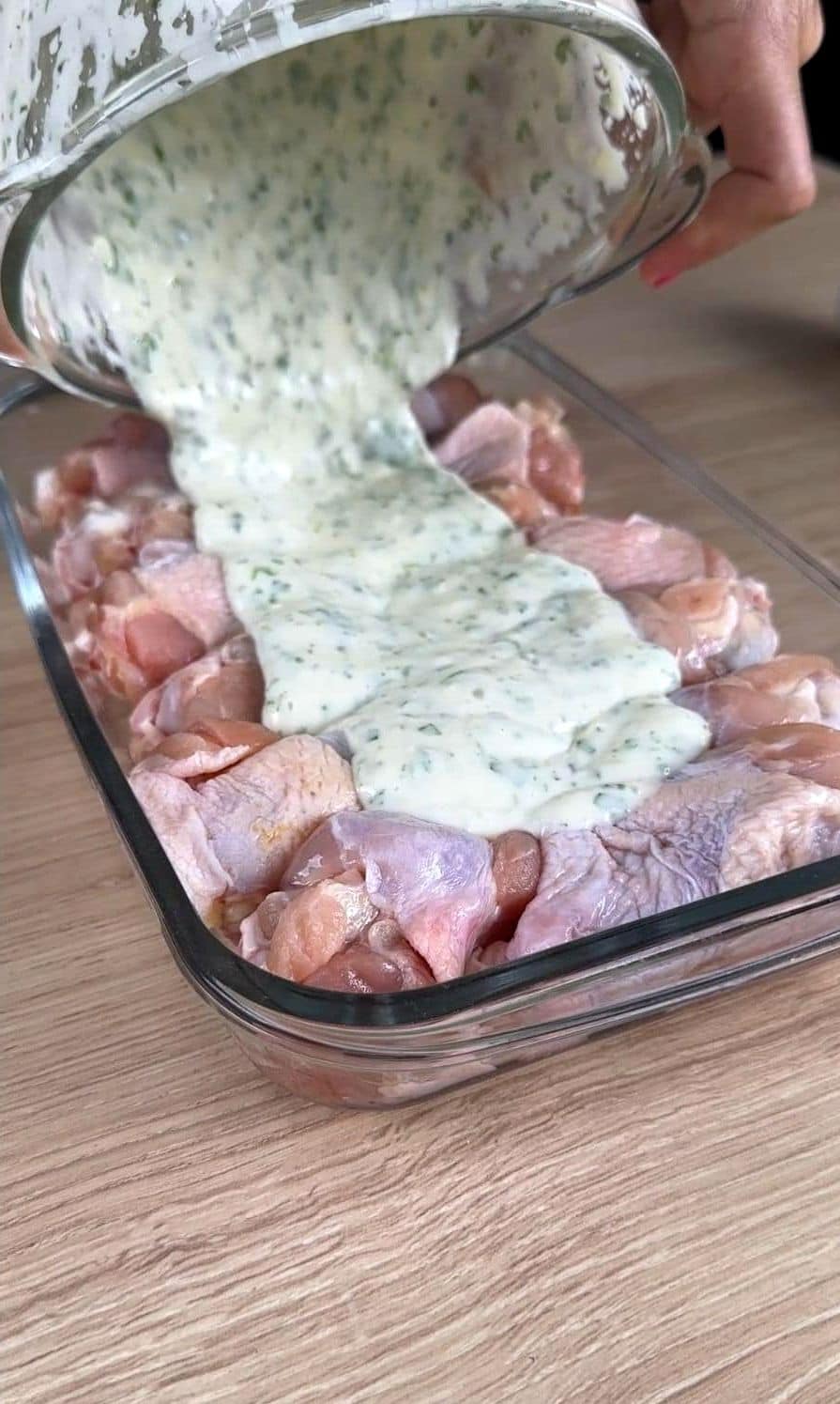 - Giet de romige knoflooksaus over de kip en zorg dat alle stukjes goed bedekt zijn.