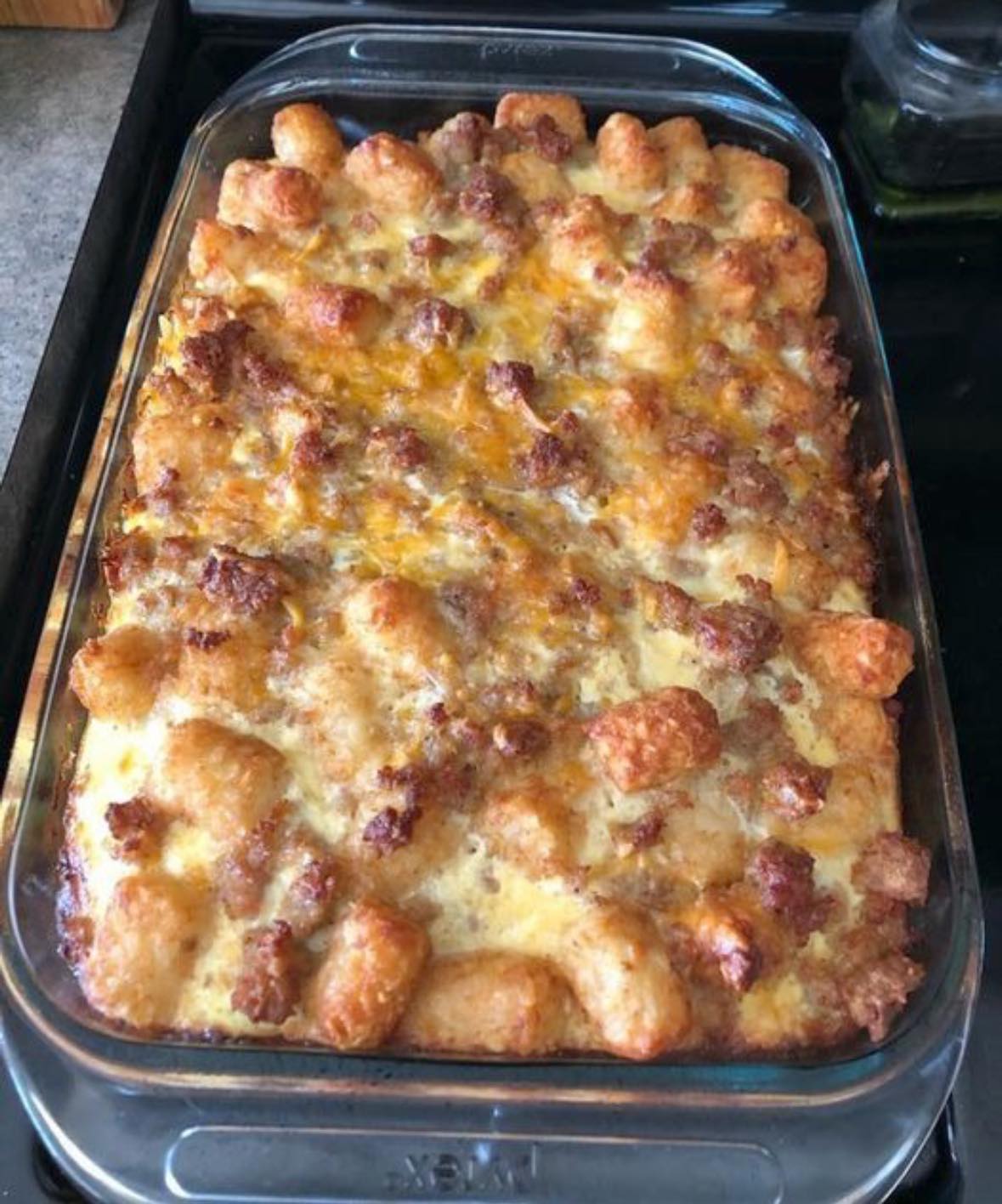 Iedereen is dol op deze handige ontbijtschotel. Maak dit van tevoren en vries het in voor later. Dit is een ongelooflijk bijgerecht om uw gasten te vermaken. Niemand kan iets verkeerd doen met tater tots, worst en kaas gecombineerd. Een heerlijke schotel die u een goed gevoel geeft en uw maag blij maakt!