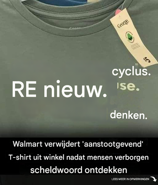 Een T-shirt met een naar verluidt beledigend karakter dat bij een lokale Walmart werd verkocht, ging viraal toen verschillende klanten op een onaangename fout in het ontwerp wezen. Een Twitter-gebruiker plaatste een foto van een groen T-shirt in de winkel dat een zeer recyclebaar kenmerk had. Op het shirt stond aan de ene kant een grote RE-tekst en aan de andere kant de zinnen ‘cycle’, ‘use’, ‘new’ en ‘think’. Het bleek dat er, ondanks de overwegend opbeurende boodschap op het T-shirt, per ongeluk een behoorlijk harde term op stond. Een woordvoerster van Walmart vertelde Newsweek: “Dit was niet opzettelijk, en het T-shirt is verwijderd.” Ter referentie: dit product was alleen verkrijgbaar in Canada.”