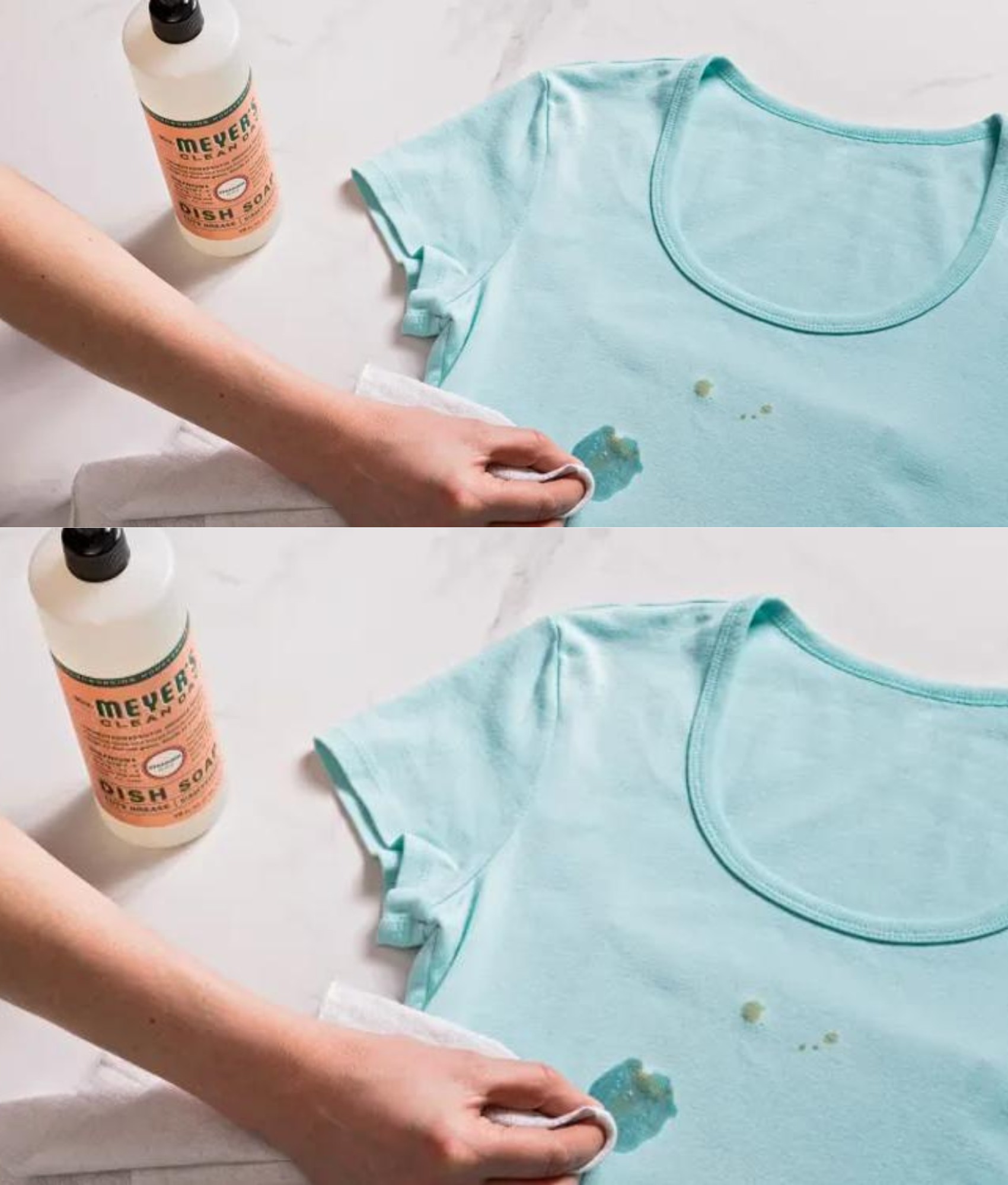 Afwasmiddel is een effectieve ontvetter. Wrijf een kleine hoeveelheid afwasmiddel op de vlek en laat het ongeveer 5 tot 10 minuten intrekken. Gebruik geen vaatwasmiddel, omdat dit te agressief kan zijn voor de stoffen van uw kleding.